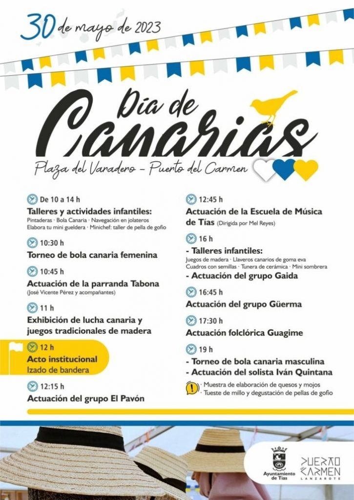El Ayuntamiento de Tías ha programado una celebración previa del Día de Canarias el 26 y 27 de mayo en Tías y en Puerto del Carmen con actuaciones folclóricas y una jornada festiva más amplia el 30 de mayo en la Plaza del Varadero. Habrá talleres infantiles, folclore, la actuación de la Escuela de Música de Tías, degustación de gofio, torneos de bola canaria y exhibición de lucha y juegos tradicionales de madera.
