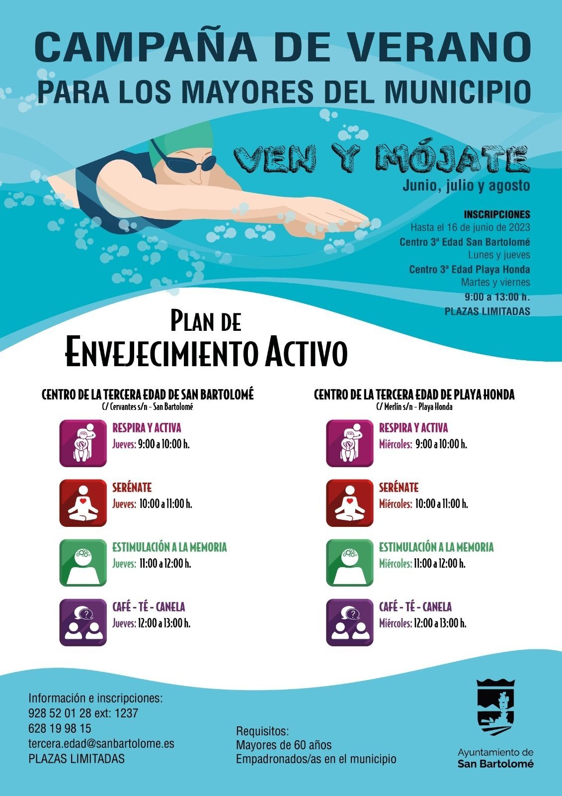 Las personas interesadas en participar podrán formalizar su inscripción en el Centro de la Tercera Edad de San Bartolomé lunes y jueves o en el Centro de la Tercera Edad de Playa Honda martes y viernes, en horario de 9:00 a 13:00 horas, hasta el próximo 16 de junio.