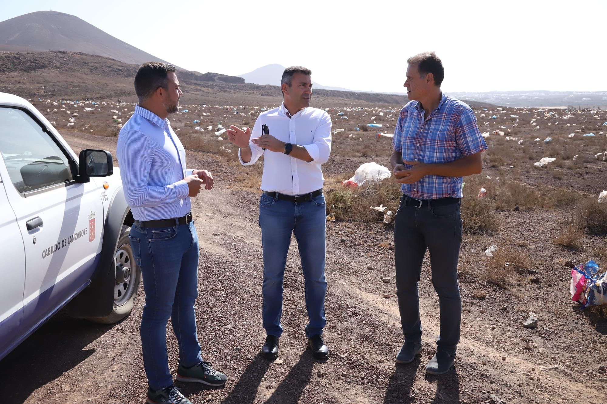 El presidente del Cabildo, Oswaldo Betancort, junto con el vicepresidente, Jacobo Medina, y el responsable del área, Domingo Cejas, visitaron hoy la zona, comprobando in situ la imagen lamentable que presentaba dicha ladera debido a cómo el viento ha desplazado los residuos del vertedero de Zonzamas hacia fuera.