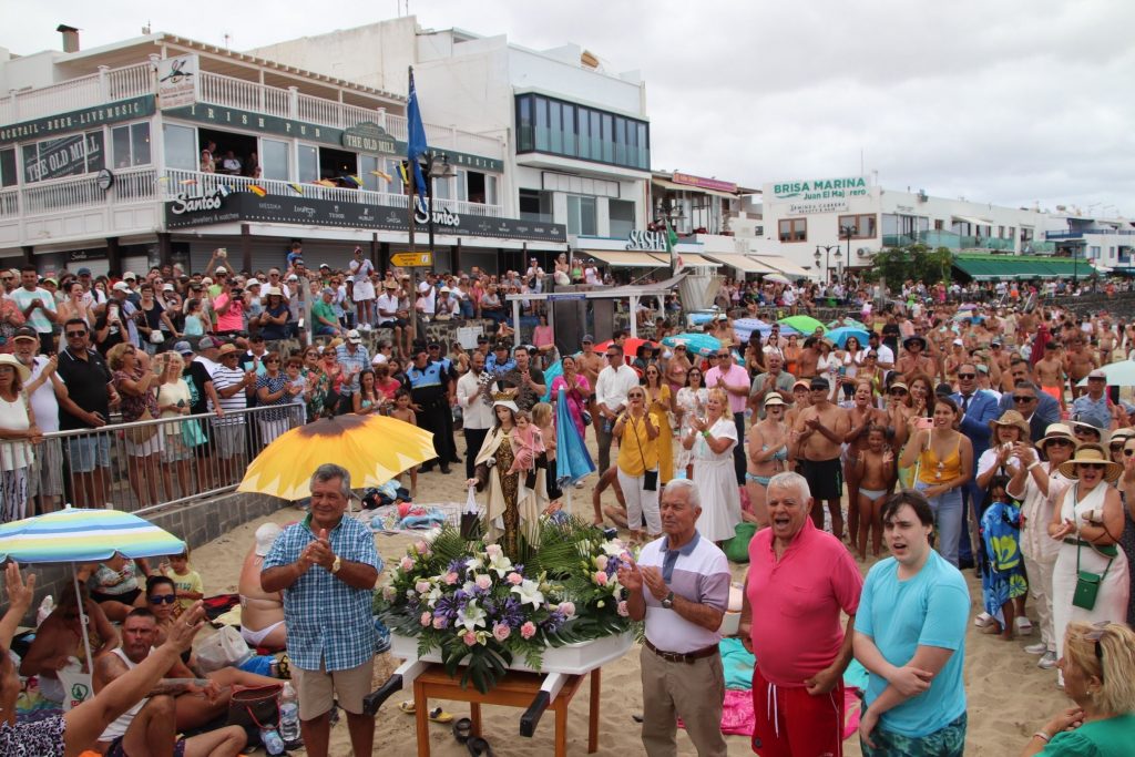 Si ya era notoria la participación en la procesión terrestre, el gentío en la playa y la avenida marítima fue impresionante. Pescadores retirados y familias marineras de toda la vida llevaron en hombros a la Virgen hasta su embarcación. Allí estuvieron vecinas como Senda Martín, Omaira Umpiérrez y Sandra Caraballo al pie de su figura para entregarla a orillas del mar al patrón mayor de la Cofradía de Pescadores de Playa Blanca, Cristo Caraballo, y un grupo de vecinos del pueblo que la cargaron en hombros hasta el barco Nuevo Santo Domingo.
