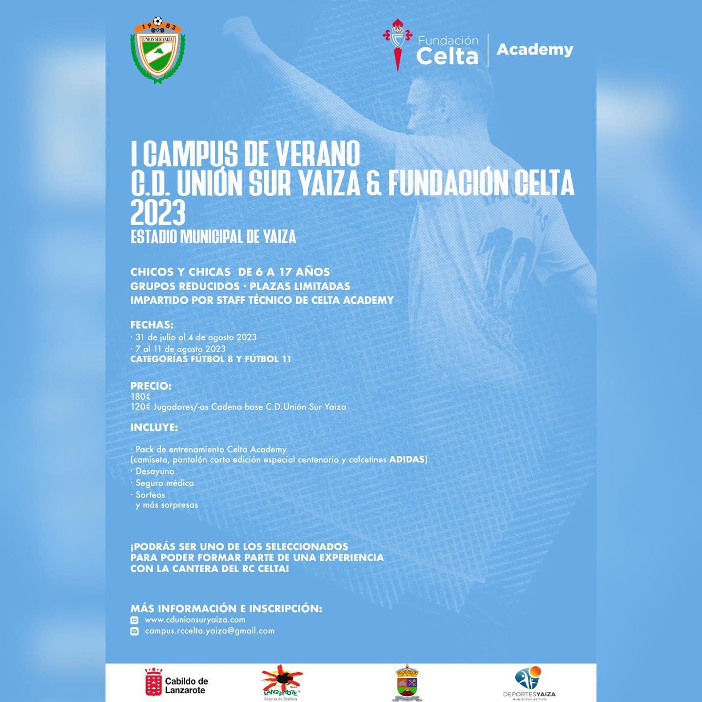 Una de las cosas que más ha llamado la atención de este I Campus de Verano CD Unión Sur Yaiza – Fundación Celta es que los inscritos tendrán la oportunidad de participar en diferentes sorteos, recibir numerosas sorpresas y, como colofón, podrán ser seleccionados para formar parte de una experiencia exclusiva con la cantera del RC Celta de Vigo.