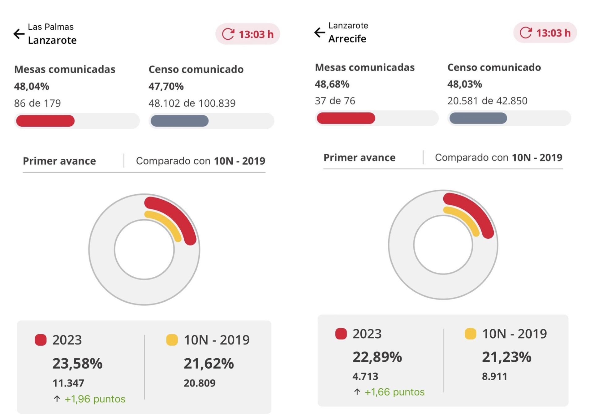 En el caso del municipio capitalino, Arrecife, el que concentra el mayor número de personas censadas para votar, la participación se ha situado en un 22,89%, un total de 4.713 votos, lo que se traduce en 1,66 puntos por encima de la registrada en 2019.