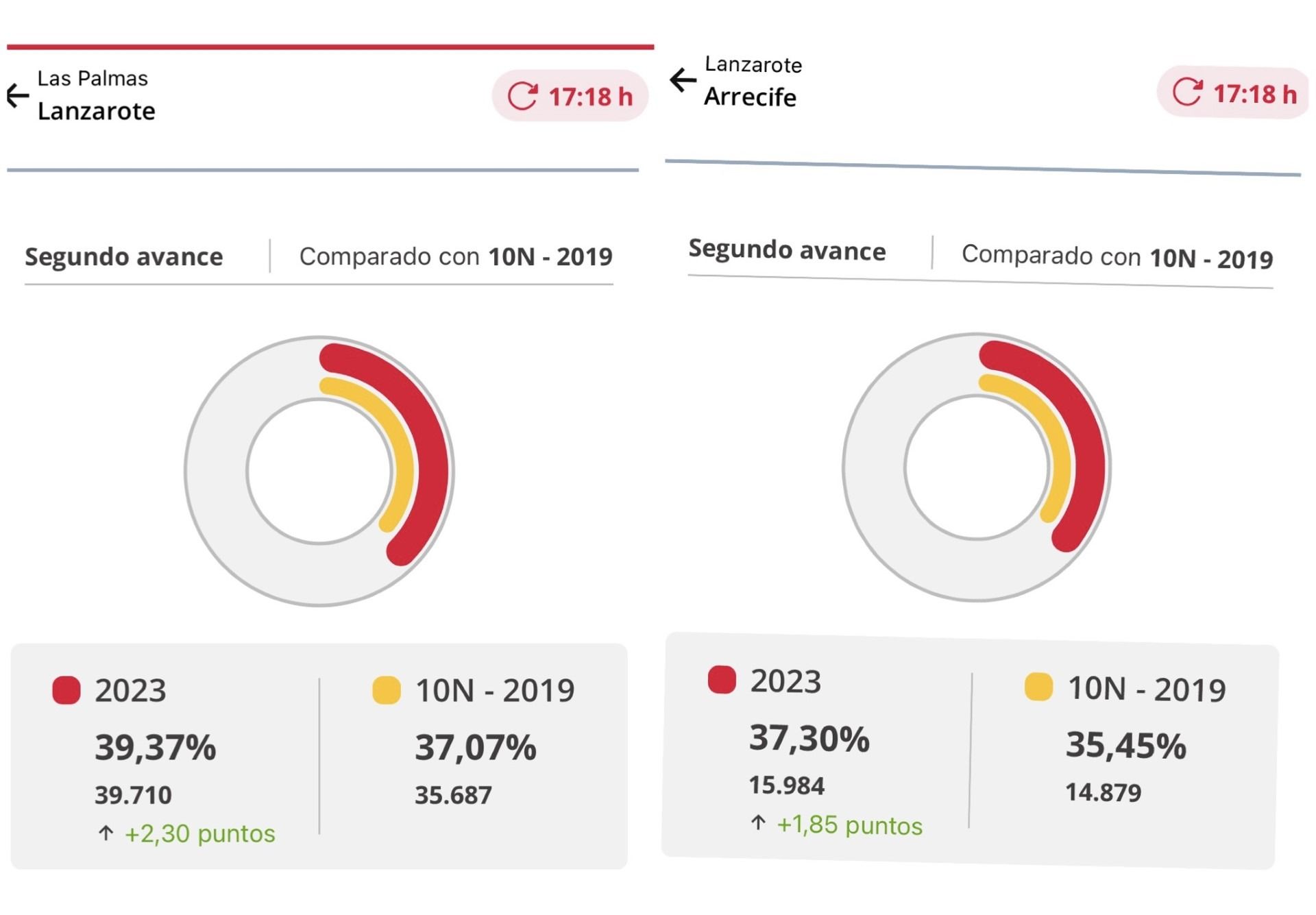 En el caso del municipio capitalino, Arrecife, el que concentra el mayor número de personas censadas para votar, la participación se ha situado en un 37,30%, lo que se traduce en casi 2 puntos por encima de la registrada en 2019.