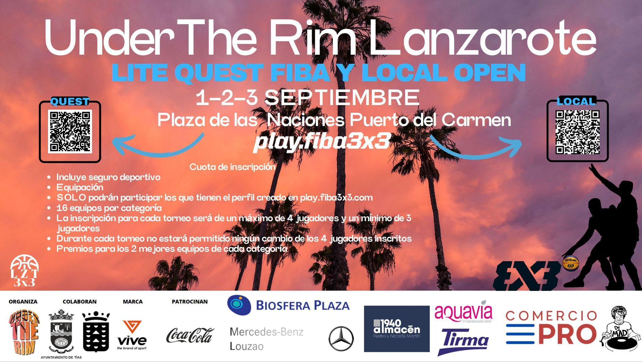 En el torneo, organizado por Under the Rim Lanzarote, colaboran el Ayuntamiento de Tías y el Cabildo de Lanzarote. Patrocinan Coca-Cola, Biosfera Plaza, Mercedes Benz Louzao, 1940 Almacén Pedro y Nicolás Martín, Aquavía, Tirma, Comercio Pro y Dr. Mad junto a Vive, the brand of sport.