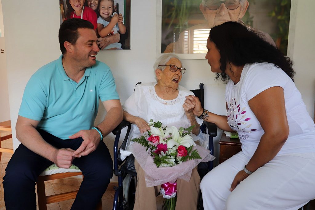 El alcalde de Yaiza Óscar Noda y la concejala Águeda Cedrés comparten un momento distendido con la vecina agasajada. La nieta de Víctor Fernández Gopar hace gala de su buen humor y amabilidad