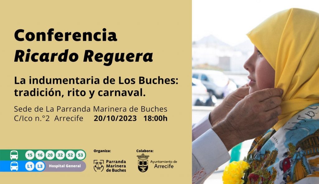 En la Sede Social de la Parranda Marinera de Buches, ubicada en Arrecife, específicamente en  la calle Ico nº 2 del barrio de Argana Baja, frente al Hospital General, tendrá lugar la  conferencia “La Indumentaria de los Buches: Tradición, Rito y Carnaval”. Esta charla será  impartida por el estudioso de la indumentaria tradicional de las Islas Canarias, Ricardo  Reguera Ramírez, a las 18:00 h del viernes 20 de octubre de 2023.
