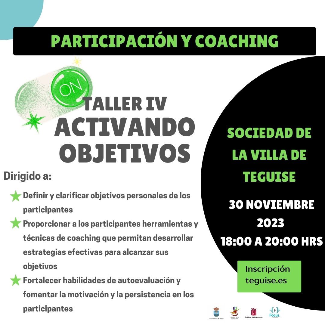 La concejalía de Participación Ciudadana del Ayuntamiento de Teguise, en colaboración con el Cabildo de Lanzarote, se complace en invitar al próximo taller “Activando Objetivos”. El taller se llevará a cabo en la Sociedad de la Villa de Teguise, el día 30 de noviembre del 2023, de 18:00 a 20:00 horas.