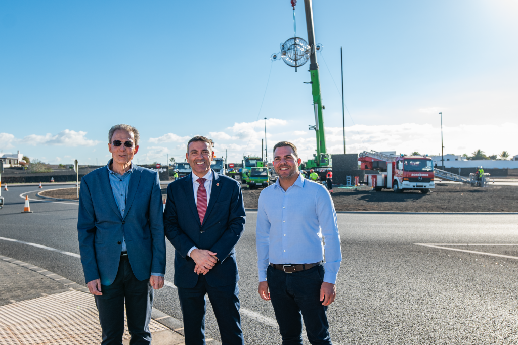 El presidente, Oswaldo Betancort, y el vicepresidente y responsable de Obras Públicas, Jacobo Medina, visitaron los trabajos de instalación en la rotonda de Tahíche en la mañana de este martes, donde trabajaron técnicos e instaladores del Cabildo y bomberos del Consorcio de Seguridad y Emergencias de Lanzarote.