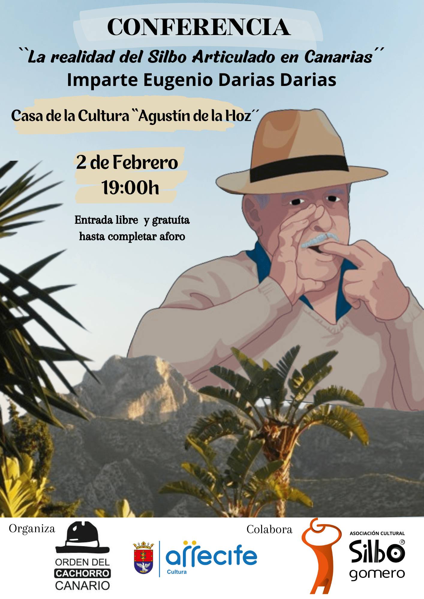 Sobre esta atractiva temática versará la conferencia ‘La realidad del silbo articulado en Canarias’ que ofrecerá Darias a partir de las 19 horas de este viernes 2 de febrero en la Casa de la Cultura Agustín de la Hoz organizada por el Ayuntamiento de Arrecife, presidido por el alcalde Yonathan de León Machín, y la Orden del Cachorro Canario, en colaboración con la Asociación Cultural Silbo Gomero.