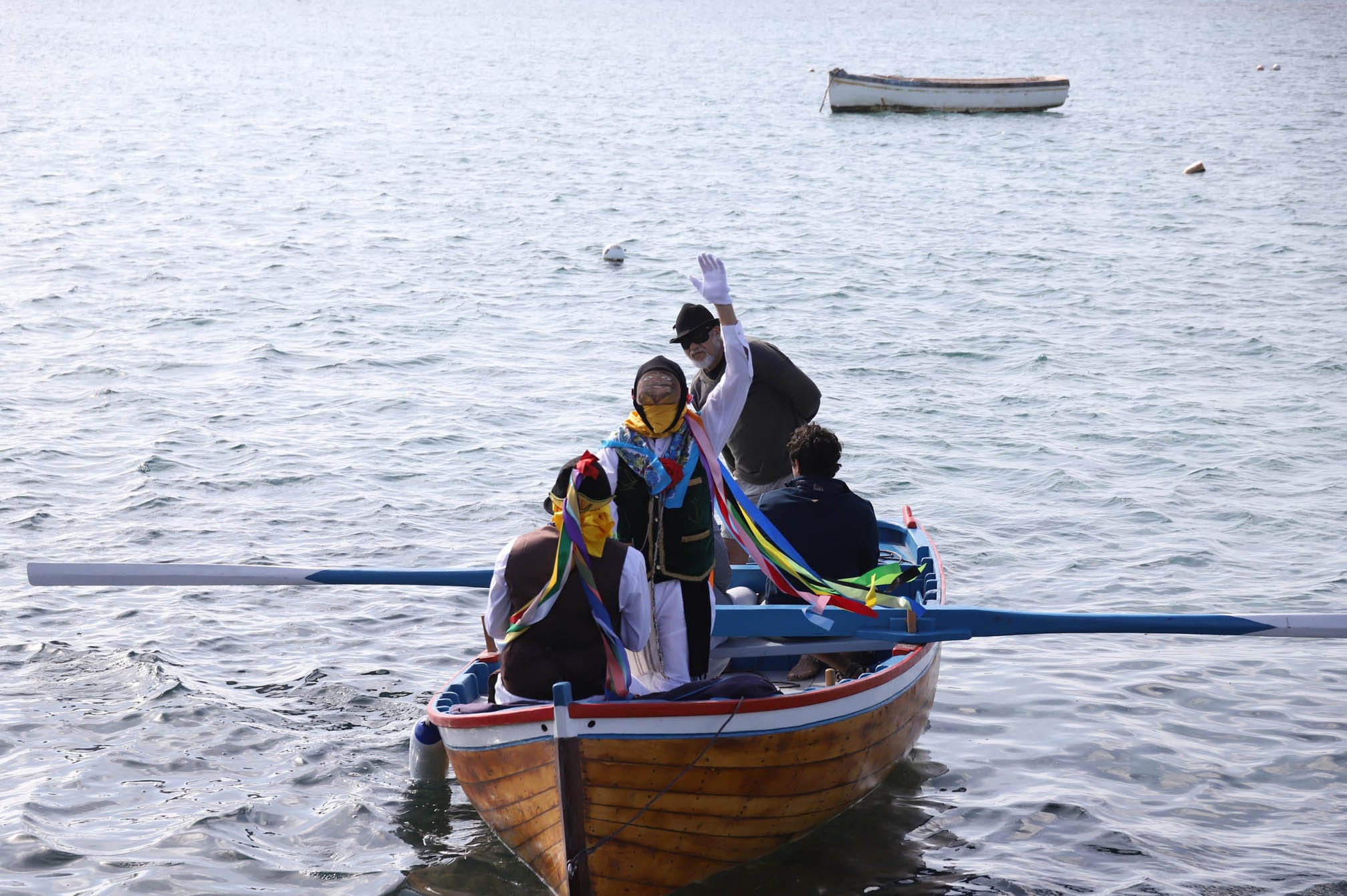 El Carnaval Tradicional de Arrecife desembarcó en la mañana de ayer sábado por el Muelle de La Pescadería de la mano del presidente de la Parranda de Los Buches, Juan Antonio Machado, y del pregonero de las Fiestas, el humorista lanzaroteño Kike Pérez, que atracaron en el emblemático muelle capitalino a bordo del bote ‘El Volador’, creado para la parranda marinera por el maestro carpintero de ribera Agustín Jordán.