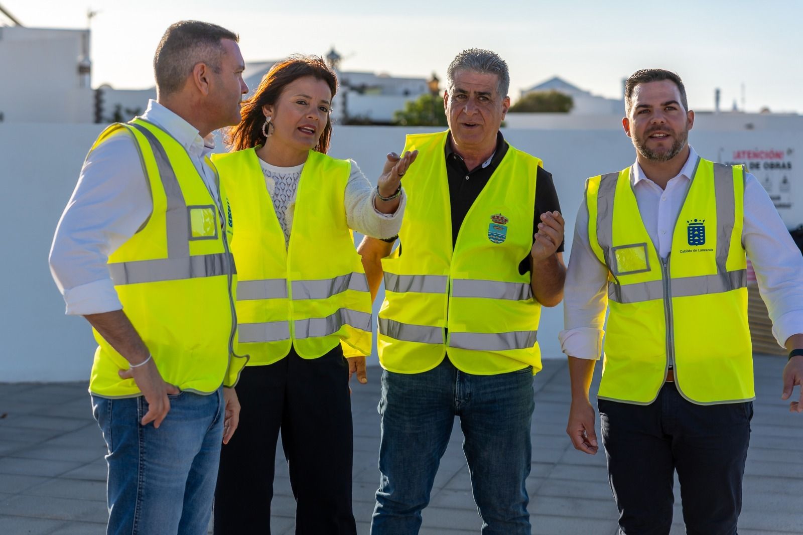 El presidente del Cabildo, Oswaldo Betancort, junto al vicepresidente y responsable de Obras Públicas, Jacobo Medina, la alcaldesa de Teguise, Olivia Duque, y el edil de Obras, Eugenio Robayna, visitaron la intervención en la calle Gustavo Adolfo Bécquer