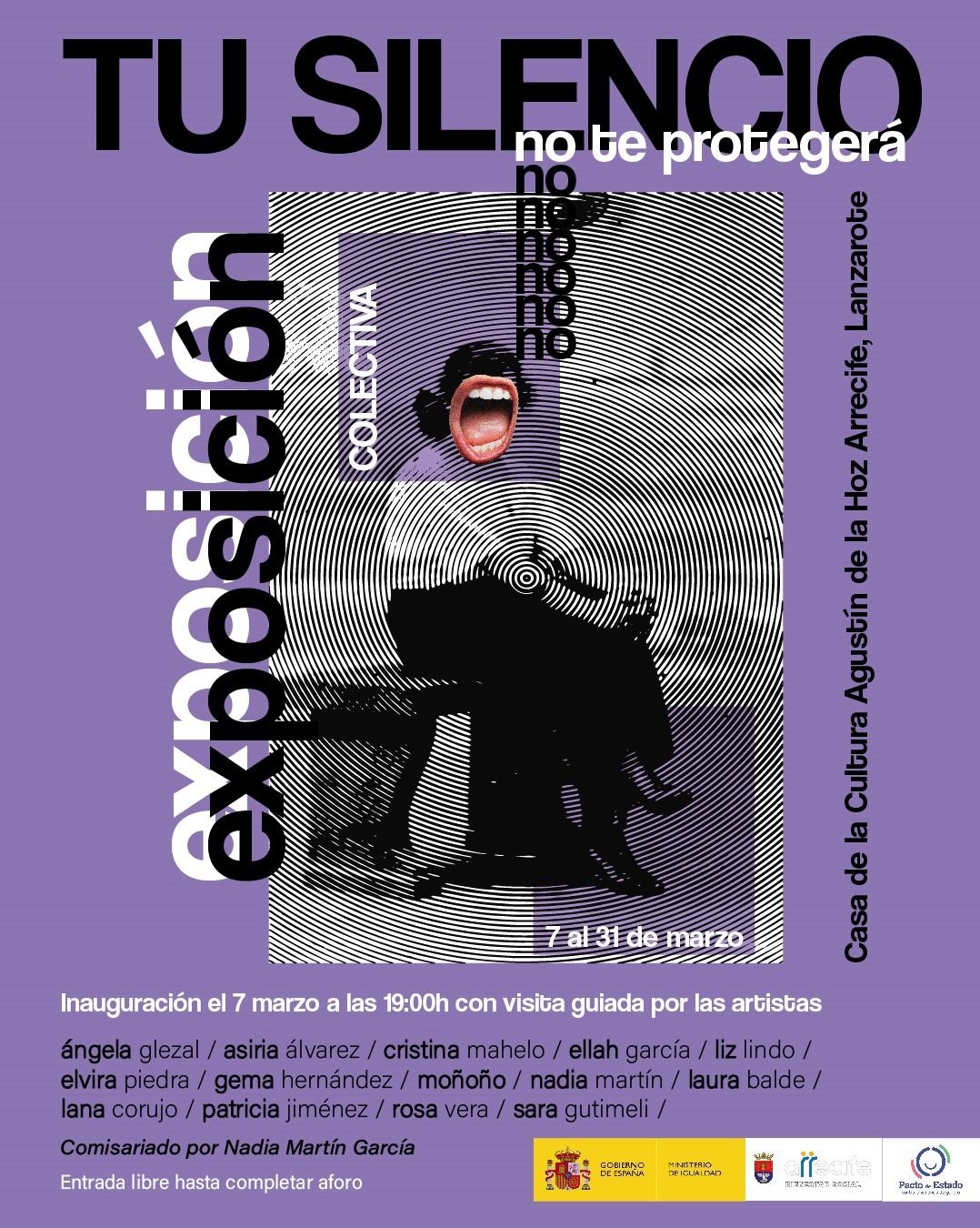 La Casa de la Cultura Agustín de la Hoz acogerá, a partir de este jueves 7 de marzo, la exposición “Tu silencio no te protegerá: artivismo colectivo para no callar”; una muestra colectiva de artistas canarias por el 8M, organizada el Ayuntamiento de Arrecife, que preside Yonathan de León, a través del Área de Bienestar Social, Igualdad e Inmigración, dirigida por Maite Corujo, en colaboración con la Concejalía de Cultura, que coordina Abigail González, y que se inaugurará a partir de las 19:00 horas.