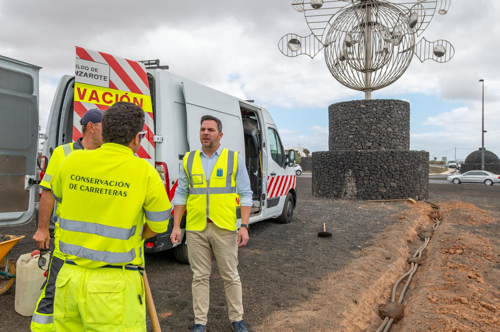 El vicepresidente y responsable de Obras Públicas, Jacobo Medina, supervisó los trabajos de instalación de toda la iluminaria que embellecerá la rotonda junto a la Fundación César Manrique