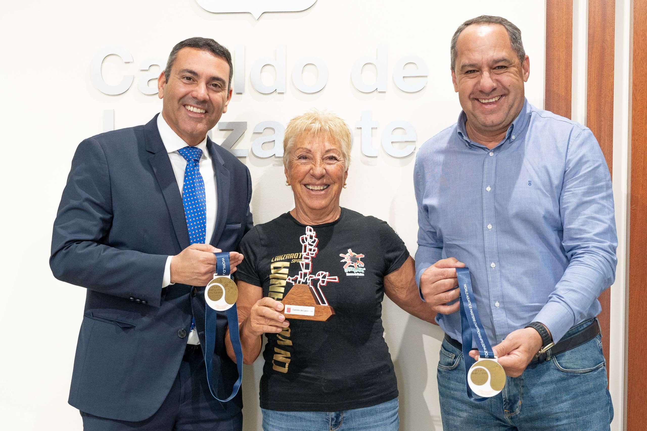 El presidente del Cabildo de Lanzarote, Oswaldo Betancort, junto al consejero del Área de Deportes, Juan Monzón, han recibido a la nadadora Rosa Segarra, ganadora de la prueba de 800 metros libre en los Campeonatos del Mundo Masters Doha 2024.