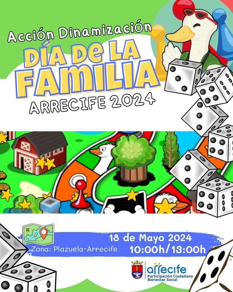 El Ayuntamiento de Arrecife, a través de las concejalías de Participación Ciudadana y Bienestar Social, dirigidas por Cathaysa Suárez y Maite Corujo, organizan una jornada de actividades para celebrar el Día de la Familia (que se conmemora hoy miércoles 15 de mayo), que tendrá lugar el sábado 18 de mayo de 10:00 a 13:00 horas en la zona de La Plazuela.