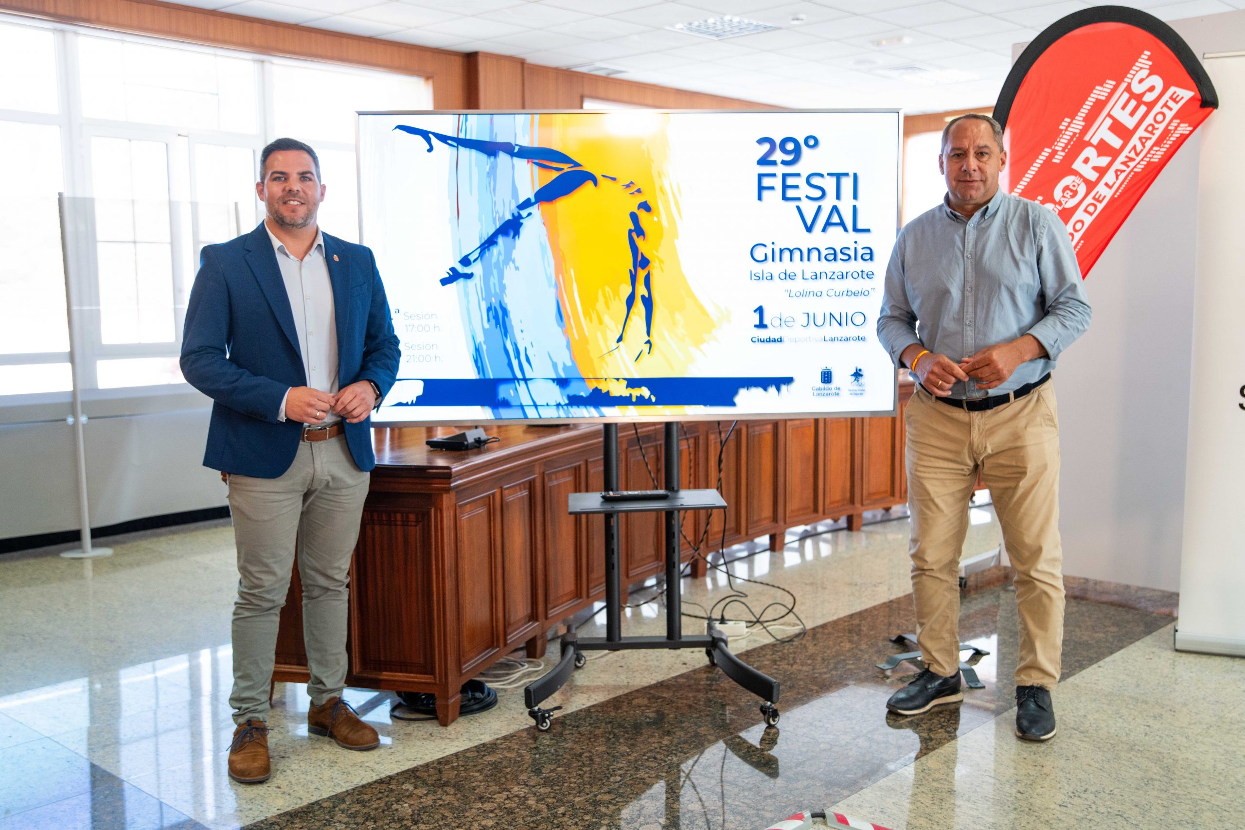 El vicepresidente del Cabildo de Lanzarote, Jacobo Medina, junto al consejero de Deportes, Juan Monzón, presentaron este martes la XXIX edición del Festival de Gimnasia Isla de Lanzarote, que se celebrará el próximo 1 de junio en dos sesiones en la Ciudad Deportiva Lanzarote.