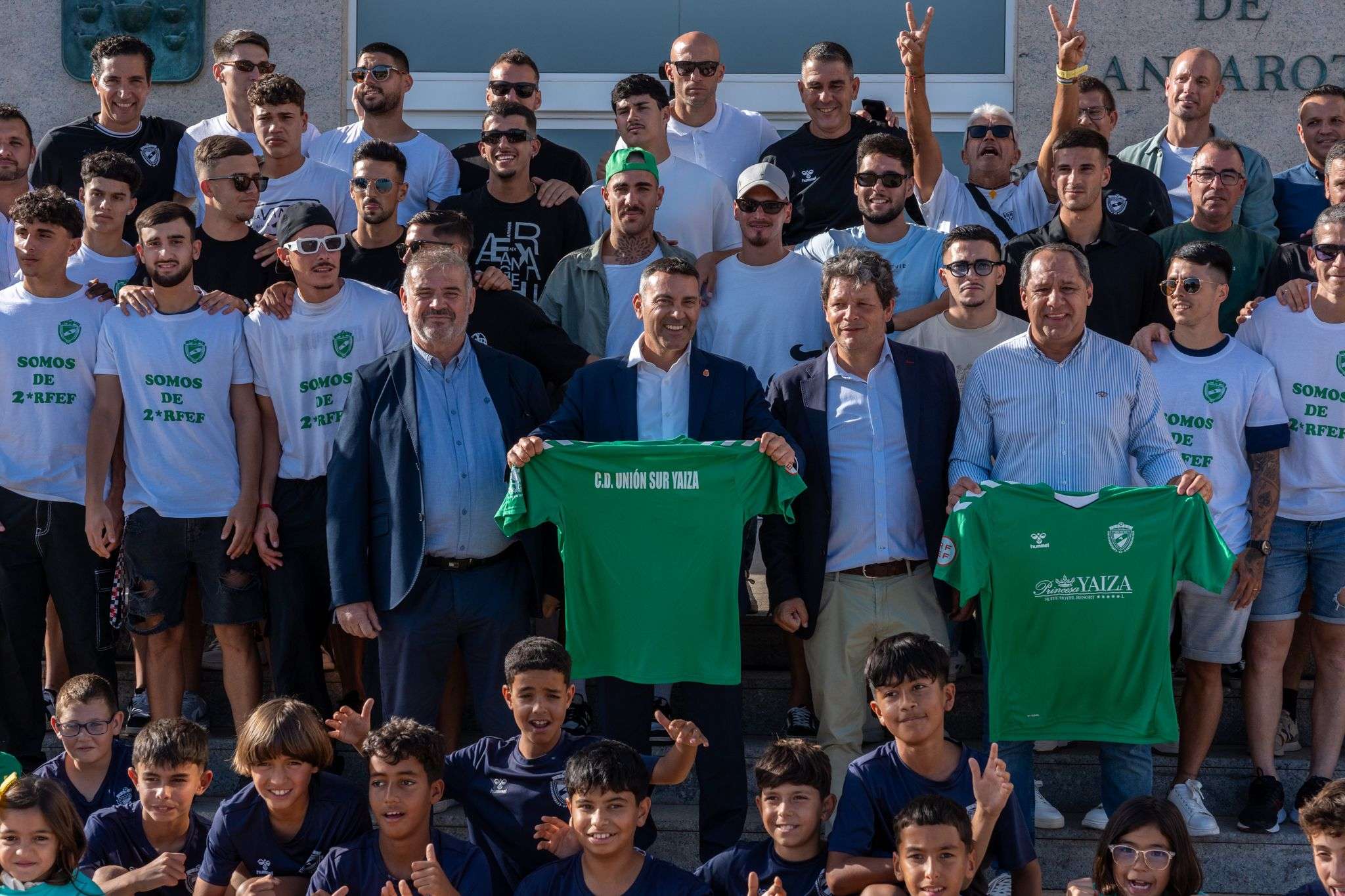 El presidente del Cabildo de Lanzarote, Oswaldo Betancort, junto al consejero de Deportes, Juan Monzón, recibieron este lunes al Unión Sur Yaiza tras la consecución del ascenso a Segunda División RFEF, eliminando en la última eliminatoria al Portugalete.