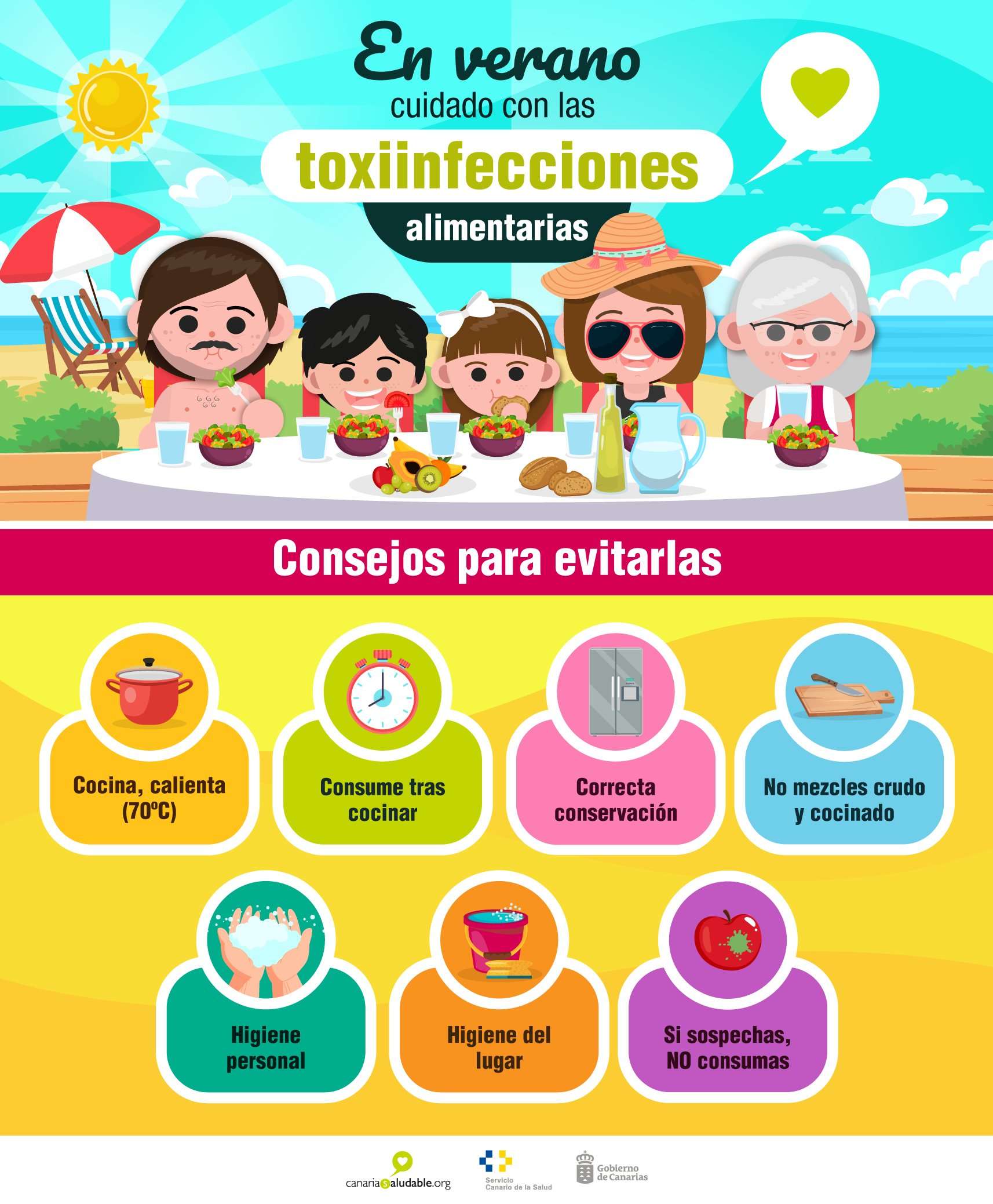 La Consejería de Sanidad del Gobierno de Canarias quiere recordar que la mejor forma de prevenir toxiinfecciones alimentarias es adoptando medidas de prevención elementales, tanto en la elaboración de alimentos en nuestro domicilio como en el consumo de los mismos en restaurantes y chiringuitos. Las altas temperaturas de esta época del año, la falta de higiene en la cocina y la incorrecta manipulación de los alimentos, facilitan la proliferación de bacterias responsables de numerosas toxiinfecciones, de las que una gran parte se producen en el hogar.