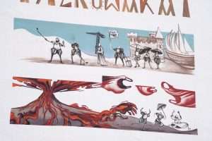 Feoflip, un artista lanzaroteño que actualmente reside en Tenerife, presenta “Bucio Roto”, una obra que narra la historia de Lanzarote como una tierra que resiste y lucha contra las cicatrices del tiempo. A través de símbolos, Feoflip nos transporta a una realidad distópica donde pasado y presente se entrelazan, creando una reflexión profunda sobre la resistencia de la isla.