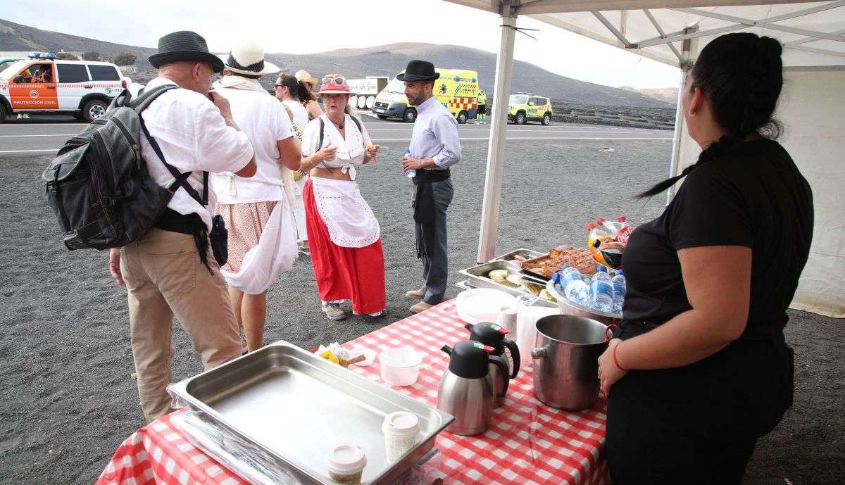 Romeros y romeros luego proseguirán su marcha en dirección al poblado de Tinguatón (zona de Chinero), donde más o menos a las 14:00 horas está previsto el almuerzo, para después emprender el tramo final de la peregrinación a Mancha Blanca. El almuerzo será con personas de Tías, ya que los ayuntamientos de Yaiza y Tías colaboran para que sus vecinos y vecinas confraternicen y coman juntos.