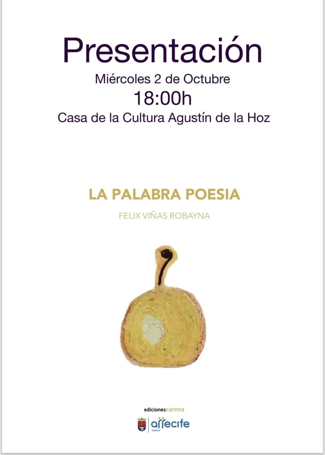 La Casa de la Cultura Agustín de la Hoz de Arrecife acoge a las 18 horas de hoy martes 2 de octubre la presentación de la obra ‘La Palabra Poesía’ del escritor y periodista lanzaroteño Félix Viñas Robayna. El acto se enmarca en el programa de actividades diseñado por Cultura Arrecife, que dirige la concejala Abigail González, para el presente mes de octubre.