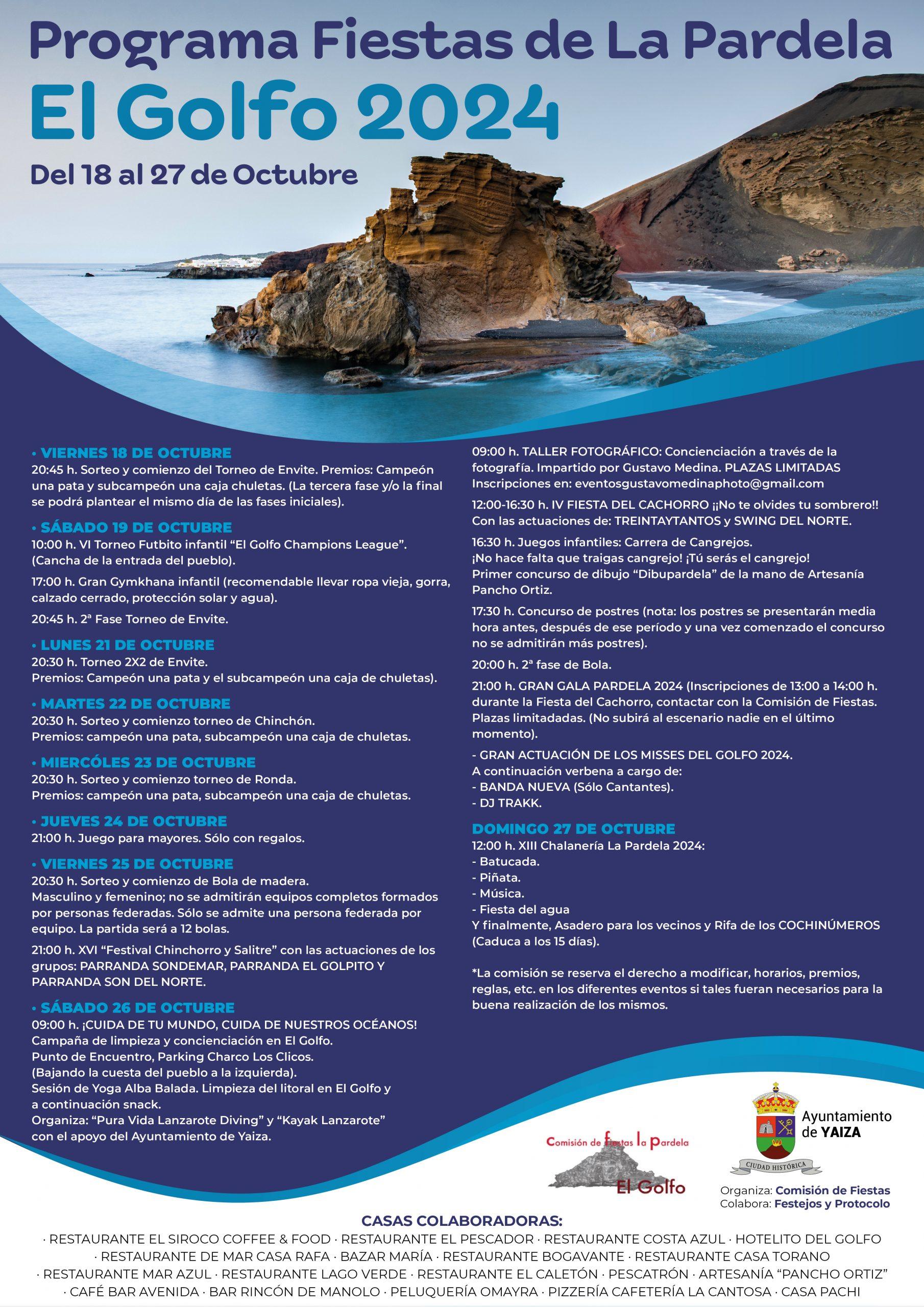 El pueblo costero de El Golfo tiene por delante toda una semana de celebraciones, del viernes 18 al sábado 27 de octubre, ya reconocidas como las fiestas populares de La Pardela, abiertas a la participación del pueblo de Lanzarote, que podrá disfrutar del programa preparado por la comisión de vecinos y vecinas, comprometidos con su organización, y el Ayuntamientos de Yaiza a través del Área de Festejos que dirige Daniel Medina.