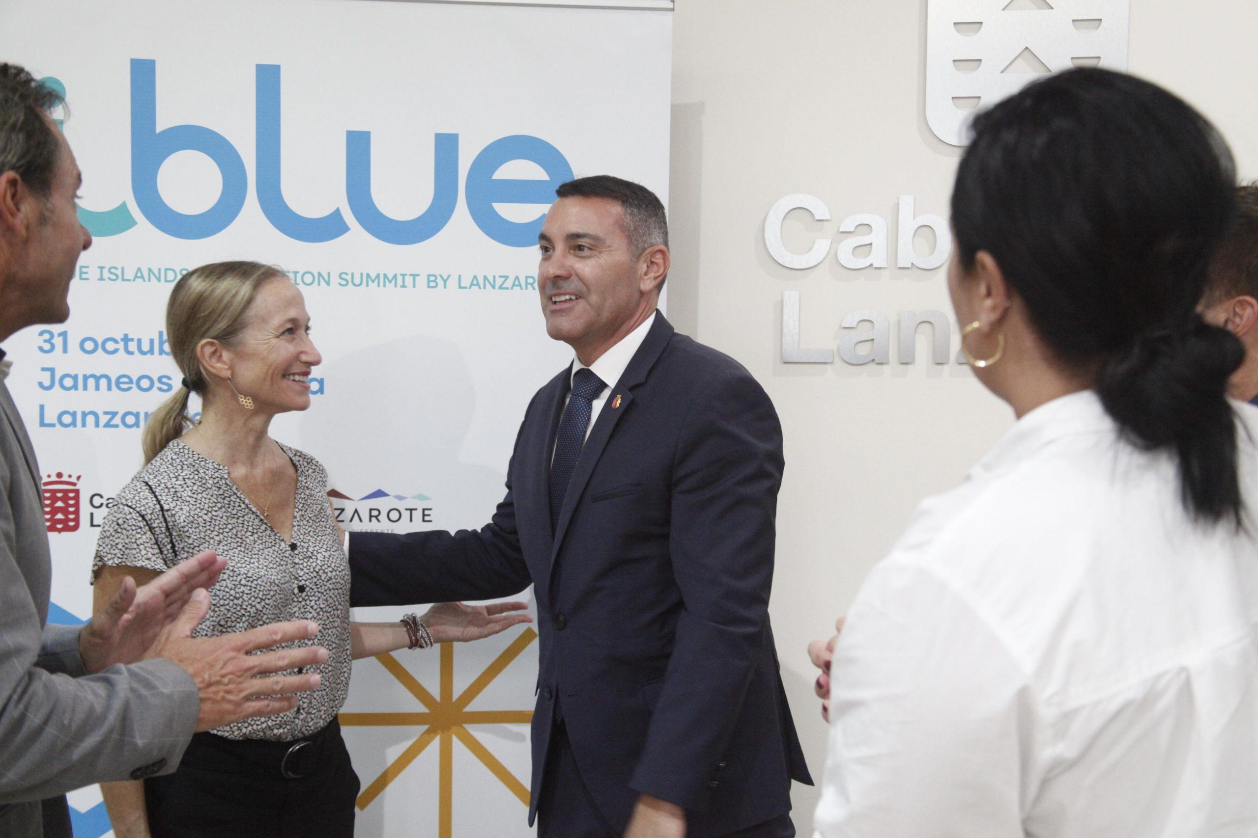 El presidente del Cabildo de Lanzarote, Oswaldo Betancort, ha recibido a la activista medioambiental Céline Cousteau junto con Enrique Acosta, director técnico del Congreso iBlue, y Héctor Fernández Manchado, consejero delegado de SPEL-Turismo Lanzarote, para abordar los objetivos clave del Congreso Turismo Azul iBlue (Blue Islands Innovation Summit), que se inicia mañana en la isla.
