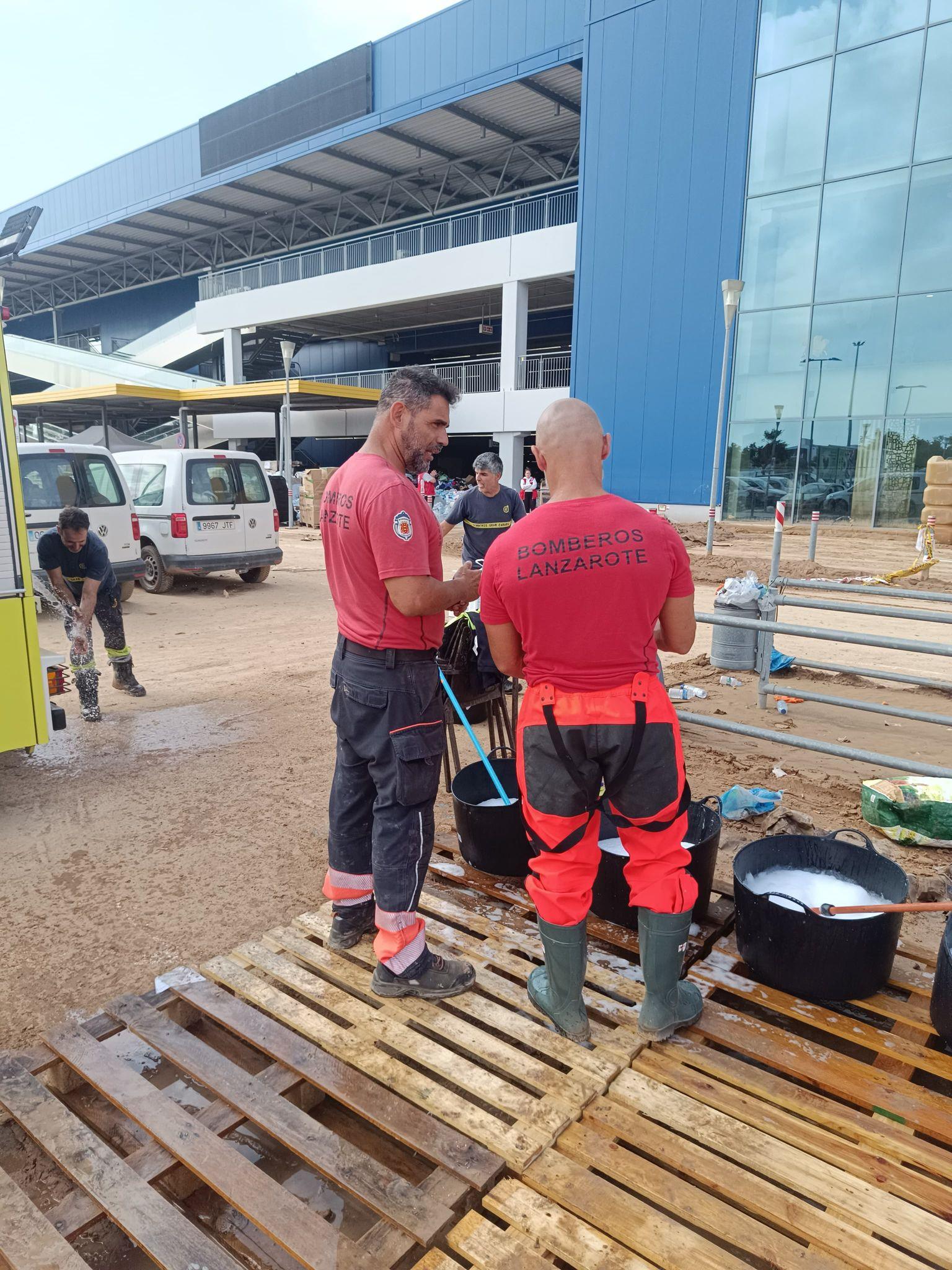 El dispositivo de bomberos del Consorcio de Seguridad y Emergencias del Cabildo de Lanzarote desplazado a Valencia desempeña labores de achique de agua en sótanos, garajes y calles, además de realizar tareas de limpieza y retirada de lodo en los cascos urbanos de Alfafar y Massanassa.