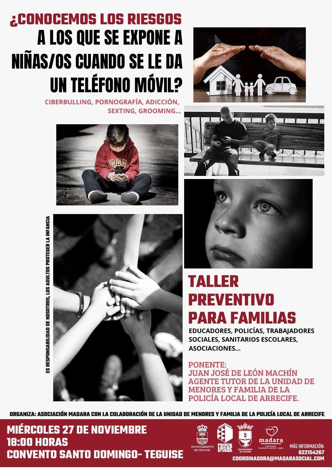 El Convento de Santo Domingo, en Teguise, acogerá este miércoles, 27 de noviembre, el taller preventivo ¿Conocemos los riesgos a los que se expone a niñas y niños cuando se le da un teléfono móvil?. El evento se desarrollará a las 18:00 horas y está dirigido a familiares, educadores, policías, trabajadores sociales, profesionales sanitarios y asociaciones, entre otros.