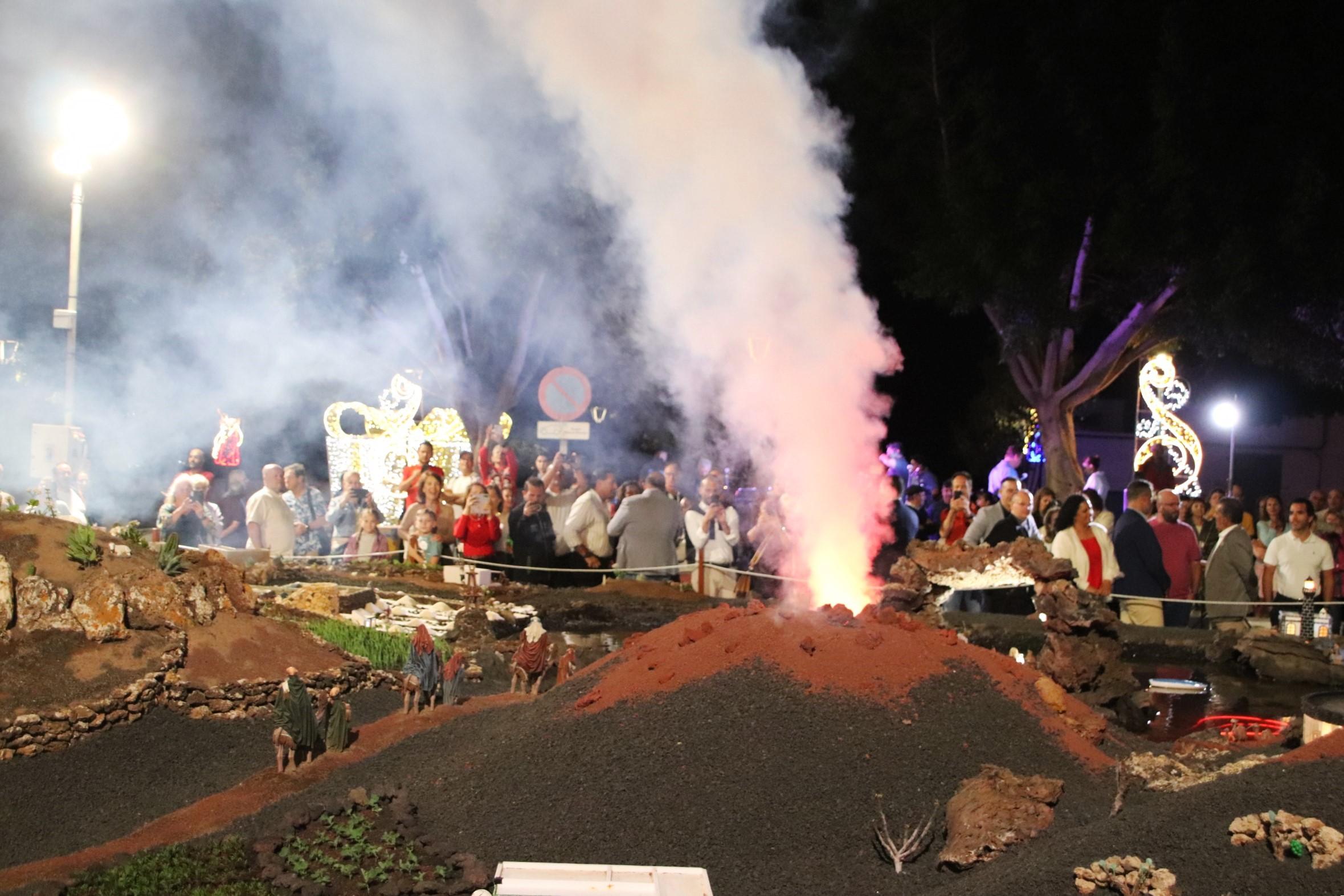 Pancho Ortiz se refirió al reto que supuso recrear la erupción del volcán: “era una idea arriesgada y no sabíamos muy bien cómo iba a salir, pero viendo las imágenes y ahora la reacción del público, pues estamos muy satisfechos y felices por el resultado y por ofrecer a nuestro pueblo de Yaiza y Lanzarote esta obra”. El belén fue bendecido por el párroco de Yaiza, Jonathan Almeida.