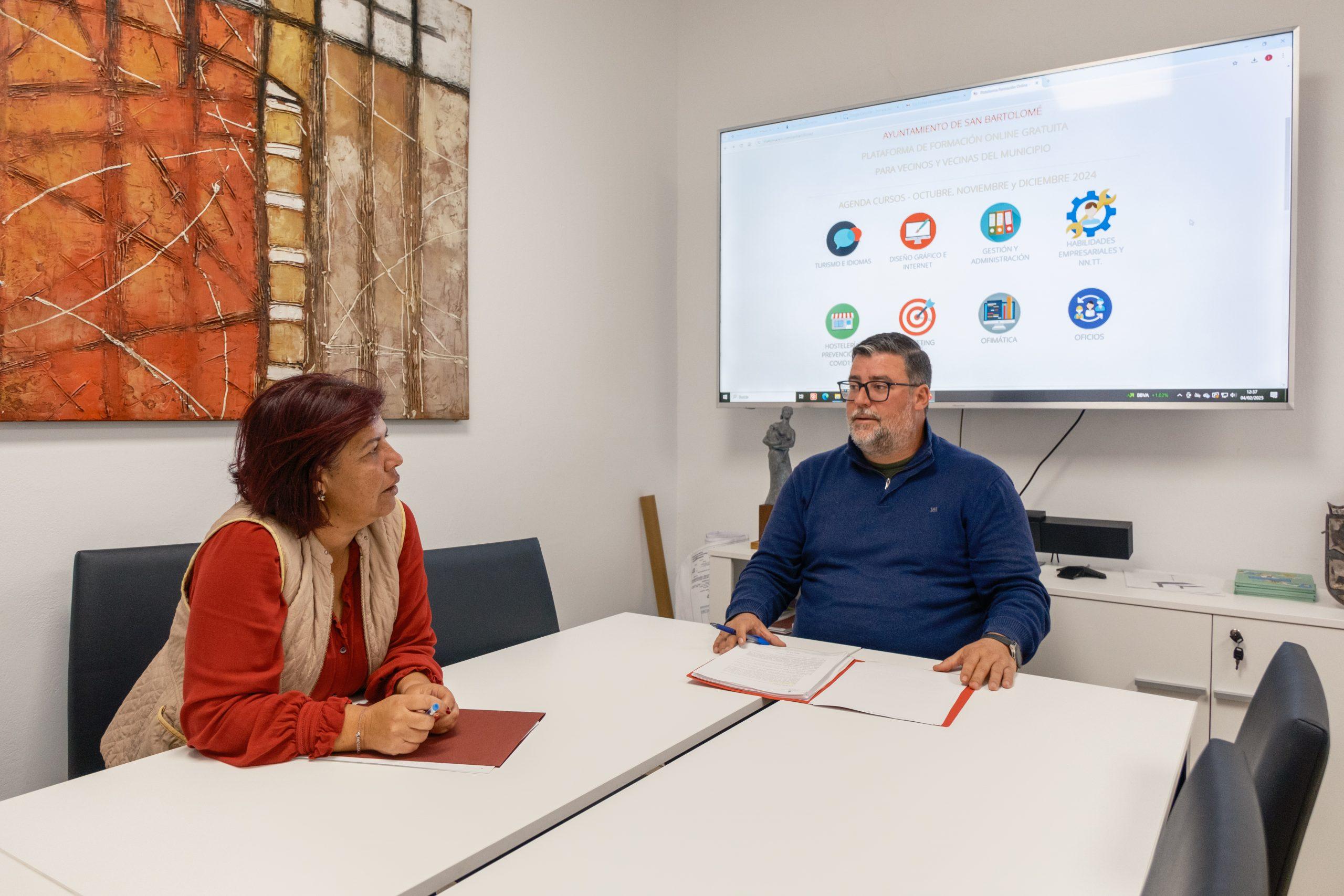 El alcalde del Ayuntamiento de San Bartolomé, Isidro Pérez, destaca “el éxito en la mejora de las cualificaciones profesionales y el acceso a oportunidades de aprendizaje gratuito de los vecinos y vecinas del municipio gracias a la plataforma en línea de formación personalizada”, que ha servido de ayuda en la búsqueda de oportunidades laborales durante los dos últimos años.