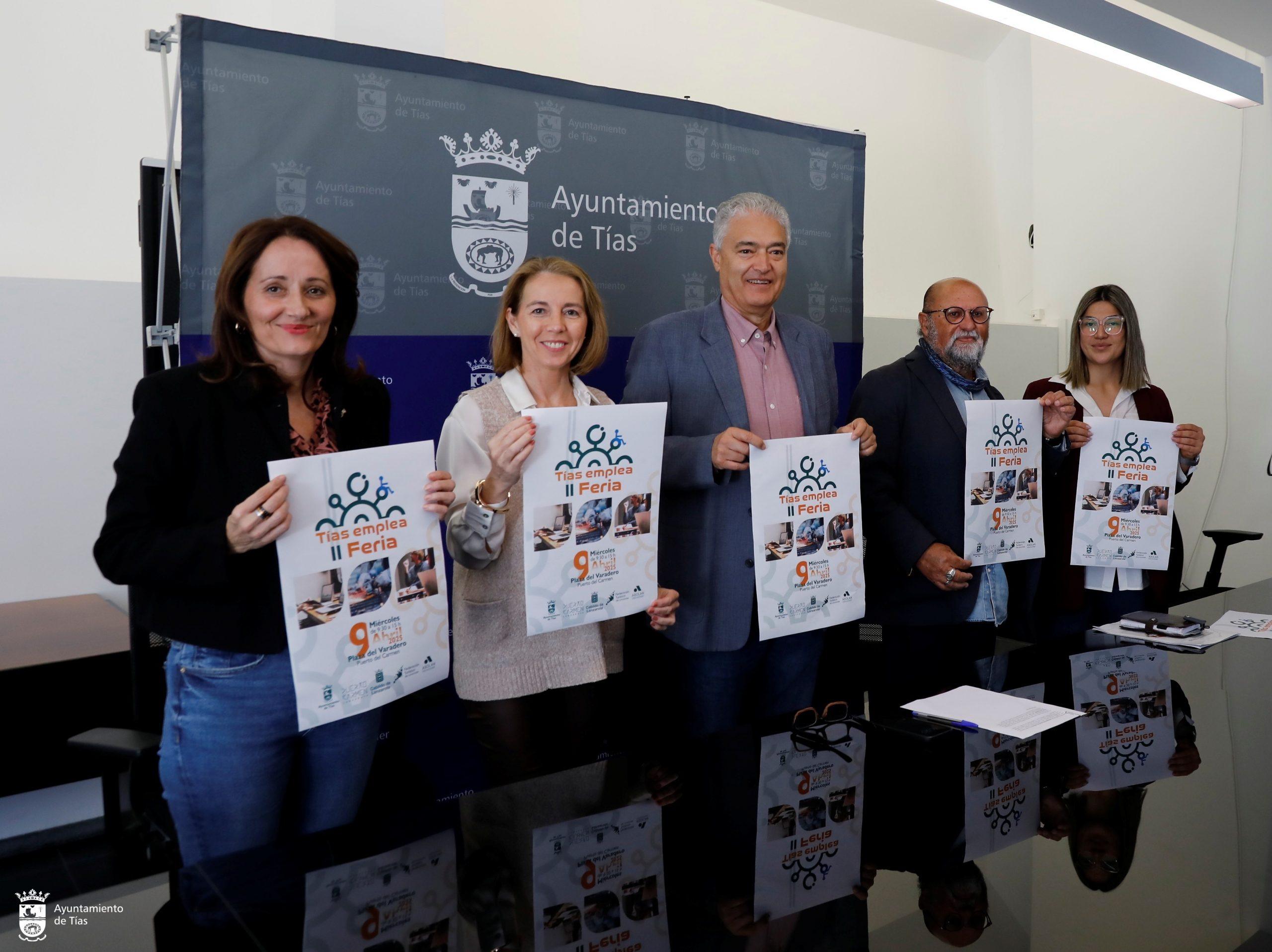 El alcalde de Tías, José Juan Cruz, presentó hoy el cartel de la II Feria Tías Emplea, junto al primer teniente de alcalde, Nicolás Saavedra, la presidenta de la Federación Turística de Lanzarote, Susana Pérez, la concejala de Empleo, Carmen Gloria Rodríguez, y la representante de la Fundación Adsis, Daniela Stroeve.