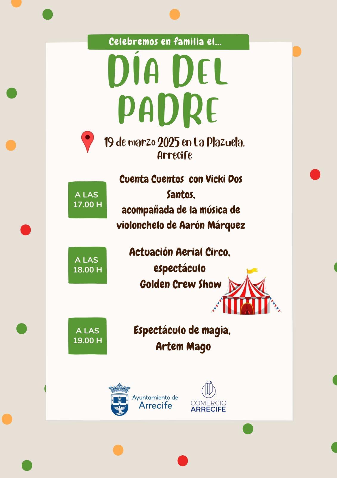 El Ayuntamiento de Arrecife ha preparado una jornada especial para la tarde de este jueves, 19 de marzo, para celebrar el Día del Padre. Cuentacuentos, circo aéreo y un show de magia que tendrán lugar a partir de las 17:00 horas, en La Plazuela.