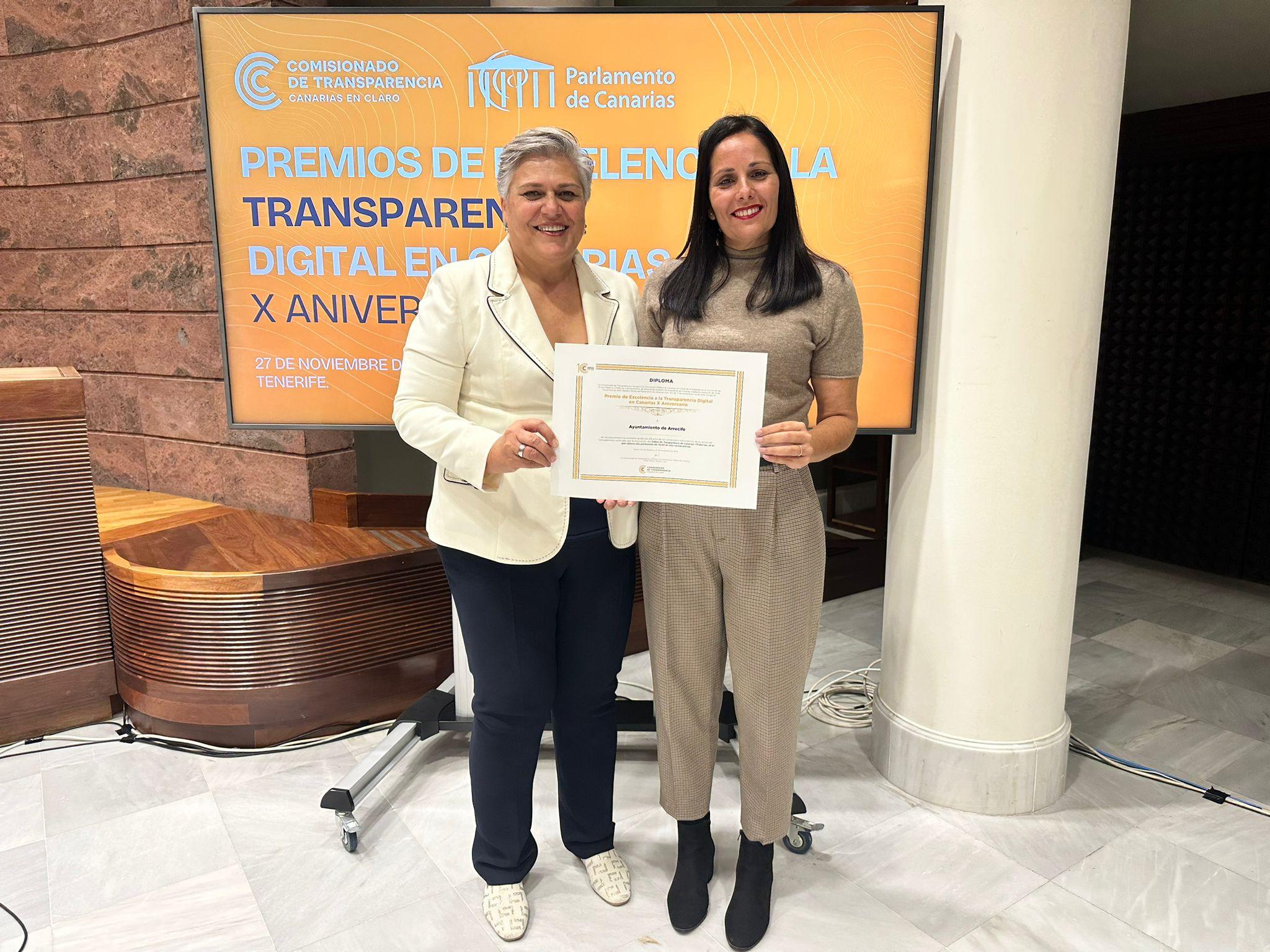 Este galardón, concedido por la Comisionada de Transparencia y Acceso a la Información Pública de Canarias, María Noelia García Leal, distingue el trabajo realizado por la Concejalía en la mejora y consolidación de la transparencia municipal.