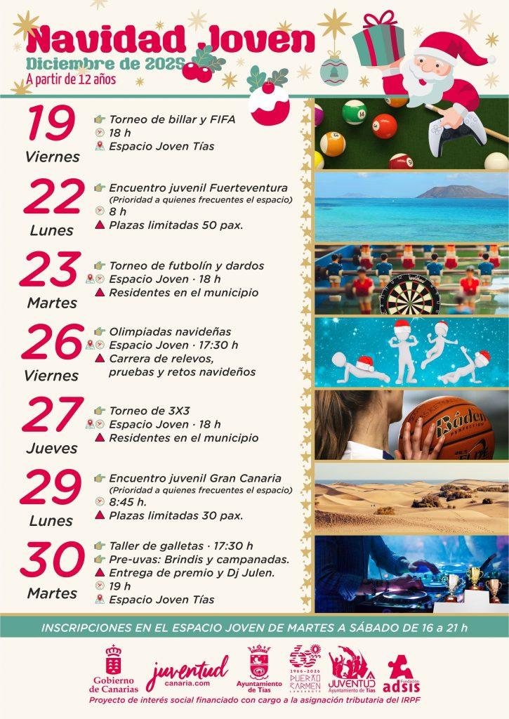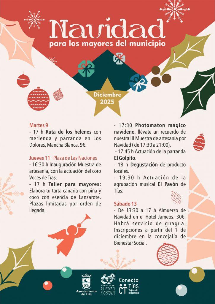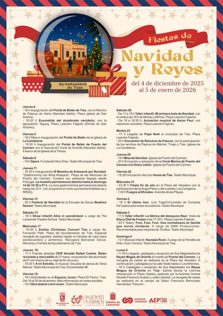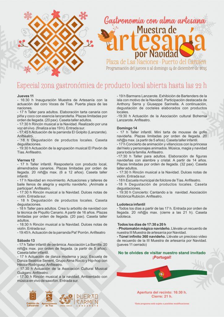 Ambas iniciativas reunirán a familias, artesanos, empresas locales y visitantes en un calendario repleto de actividades festivas, culturales y tradicionales. El programa incluye talleres infantiles, espectáculos, folclore, deporte, actividades juveniles y para mayores, gastronomía y tradiciones típicas de estas fechas. Las fiestas, que cuentan con la colaboración de la Asociación Empresarial y Pymes de Tías (AEP Tías), culminarán el 5 de enero con las cabalgatas de los Reyes Magos tanto en Tías como en Puerto del Carmen.