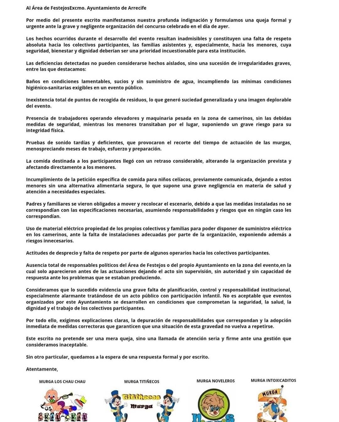 En el escrito que se encuentra a continuación, dirigido al Área de Festejos del Ayuntamiento de Arrecife, las murgas manifiestan su “profunda indignación” por el desarrollo del evento, que consideran una falta de respeto tanto hacia los colectivos participantes como hacia las familias asistentes y, especialmente, hacia los menores.