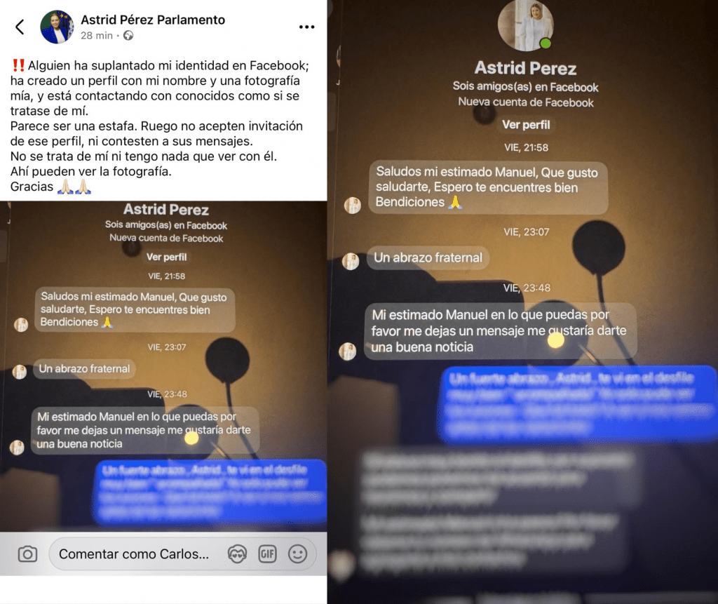 Astrid Pérez advierte sobre un perfil falso creado a su nombre que intenta contactar a conocidos con fines fraudulentos y pide máxima precaución.